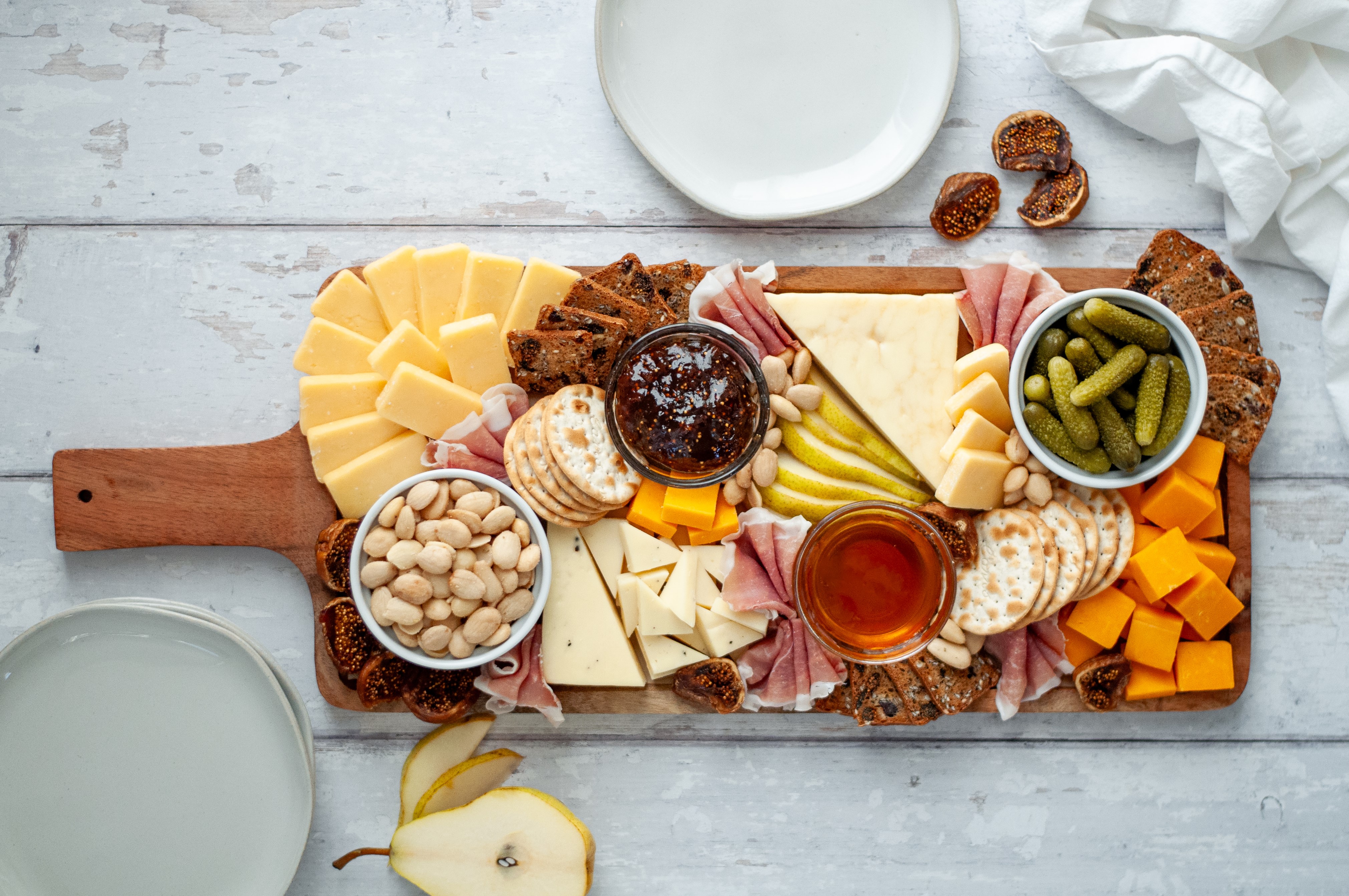 - Place pear on a serving board. Arrange prosciutto around pear. Fill in board with cheddar, bresaola, cucumbers, gouda, havarti, bell peppers and crackers. Tuck in olives, dried apricots and sage.